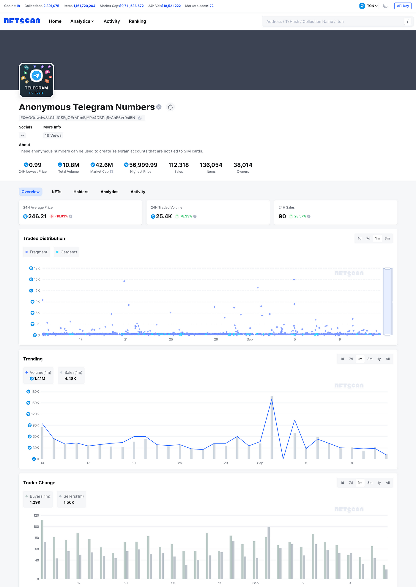 According to TON NFTScan data, as of Sep 12th, 2023, a total of 1,140,128 NFT assets have been issued on the TON chain, 9,682 NFT collections created, generated 2,710,156 on-chain transactions and 717,613 wallet addresses actively traded NFTs on TON network, generating a volume of 9,594,948.07 TON.