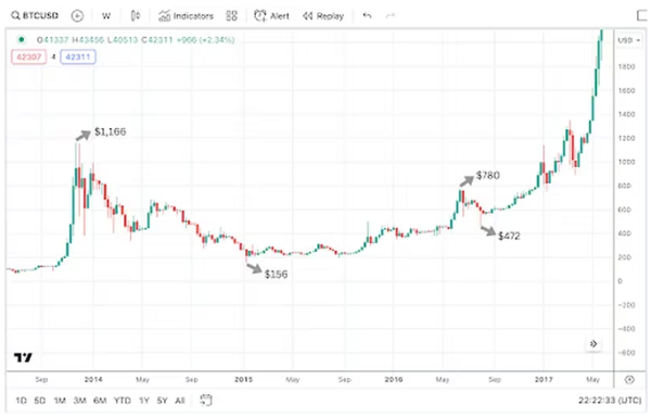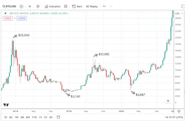From late 2017 to late 2018, bitcoin’s price fell from $19,666 to $3,150 before rebounding to $13,882 — 70% of the previous all-time high. By March 2020, its price had fallen 72% to $3,867.