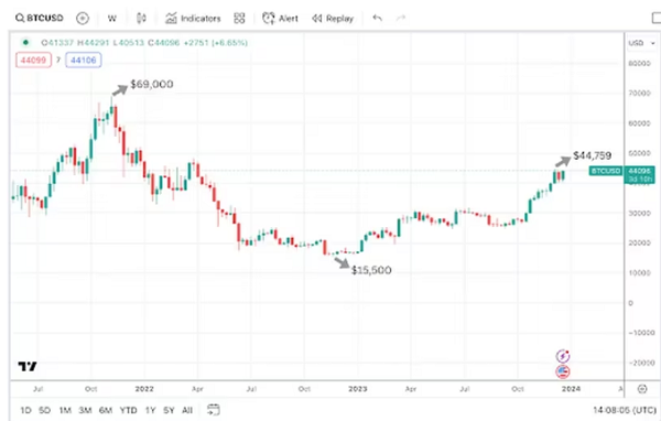During this period thus far, bitcoin’s price has fallen from $69,000 to $15,522 before rebounding to $44,759 — 65% of the previous all-time high.
