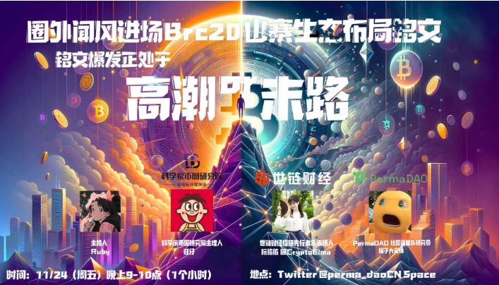In this week's Space event, PermaDAO presented a suspenseful and controversial topic: "Outsiders hearing the wind and entering the Brc20 copycat ecosystem layout for inscriptions, are inscriptions at the peak of explosion or at a dead end?" This event brought together PermaDAO's community operations & researcher - Marshal Orange, the pioneering investor and market person from World Chain Finance - Ruan Yiyi, and the head of the Scientist Coin Circle Research Institute - Wang Zai. They jointly discussed and interpreted the current trend of the inscription market, uncovering the underlying opportunities and risks. This event opened a new perspective for participants, offering a deeper understanding of the multi-dimensional complexity of the inscription market and its potential far-reaching impact.