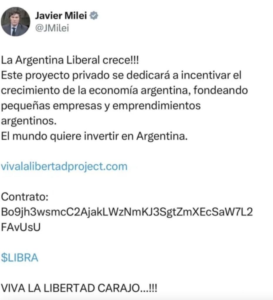 • Javier Milei : On February 14, 2025, Milei promoted $LIBRA in a post titled X, claiming to support Argentine entrepreneurs. The price rose from $0.216 to $5.54, with a market value of $4.56 billion, but plummeted 94% a few hours later, leaving a market value of only $257 million, and investors lost more than $250 million. This incident was called "Cryptogate," triggering legal investigations and calls for impeachment.