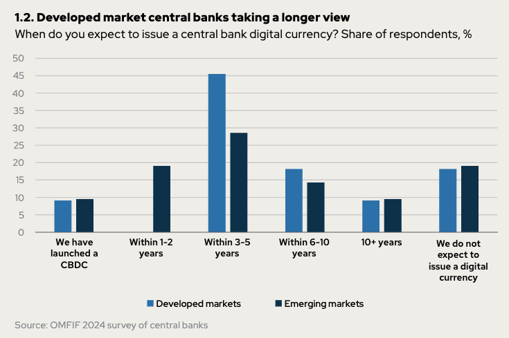 The survey rarely differentiated between retail CBDCs that target consumers, versus wholesale CBDC aimed only at institutions. The work involved in issuing a wholesale CBDC is considerably less because it’s not a major step change – banks already have central bank reserves, this is simply a version with new technology.