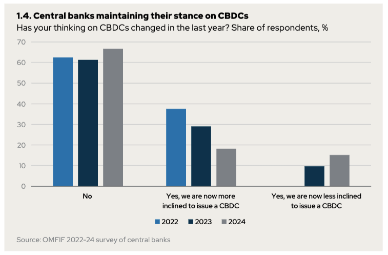 Last year’s survey by the BIS survey showed a decline in interest in retail CBDCs. While OMFIF’s survey showed more central banks (15%) are dropping CBDC plans, it didn’t split the figure by CBDC type.