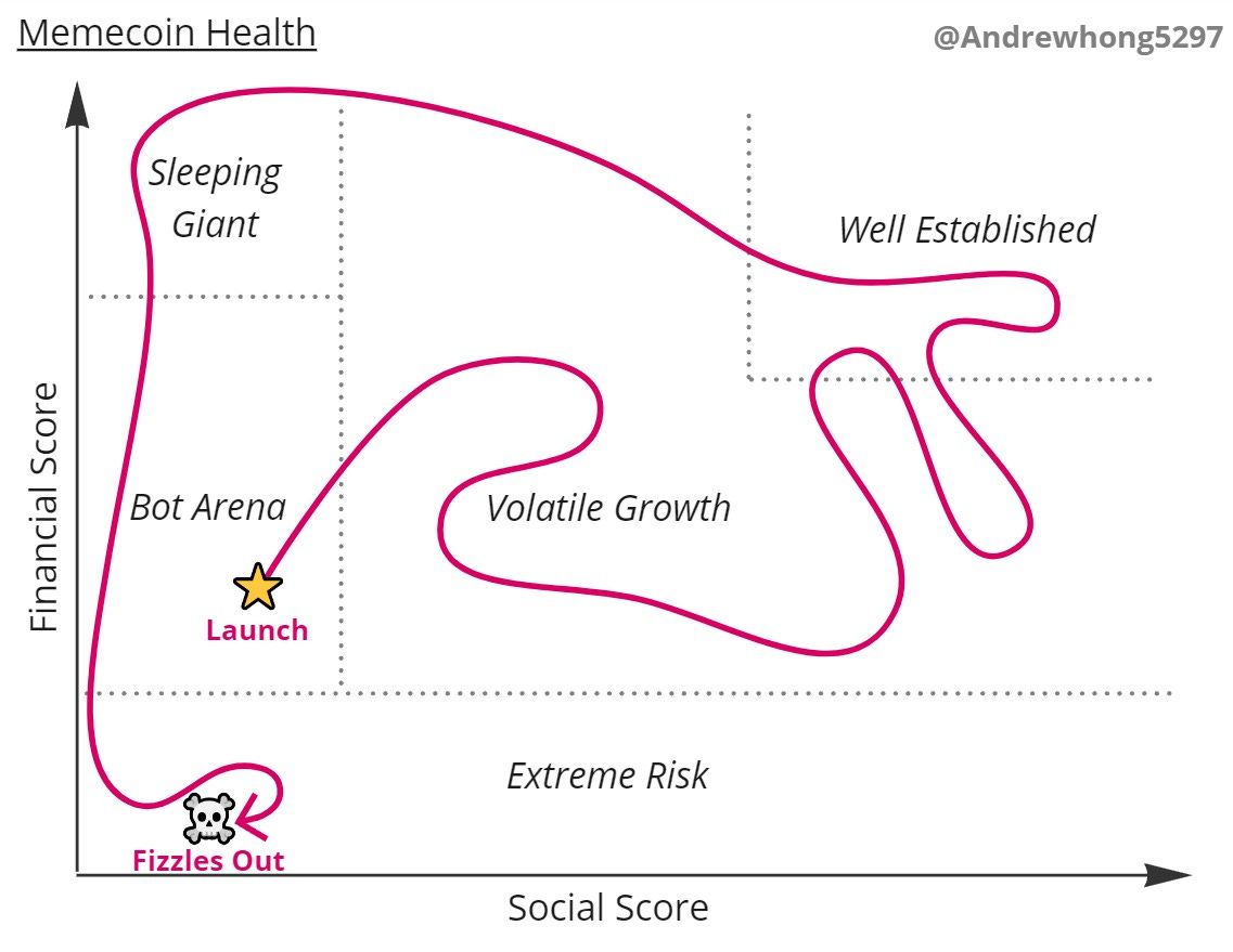 The bulk of memecoins should be stuck in the “bot arena”, with a few catchy ones in the “volatile growth” segment, and maybe one or two making it “well established”. Along the way, some may lose social power and become “sleeping giants” and others may lose their financial backing (liquidity) to become “extreme risks”.
