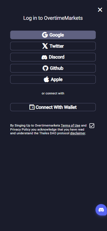 1/ The process starts once a user lands in Overtime Markets’ homepage and clicks the Log In or Sign Up button. This then allows them to either Connect a Wallet (for existing Web3 users) or, in the case most relevant to this article and non-Web3 users, connect via a social account.