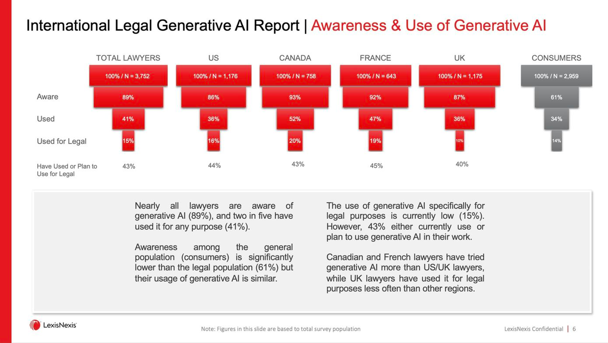 However, this does not mean that legal professionals will resist the integration of AI. According to a survey report by LexisNexis, 81% of respondents (lawyers) are already aware of the existence of generative AI, and over 40% of lawyers have used similar products.
