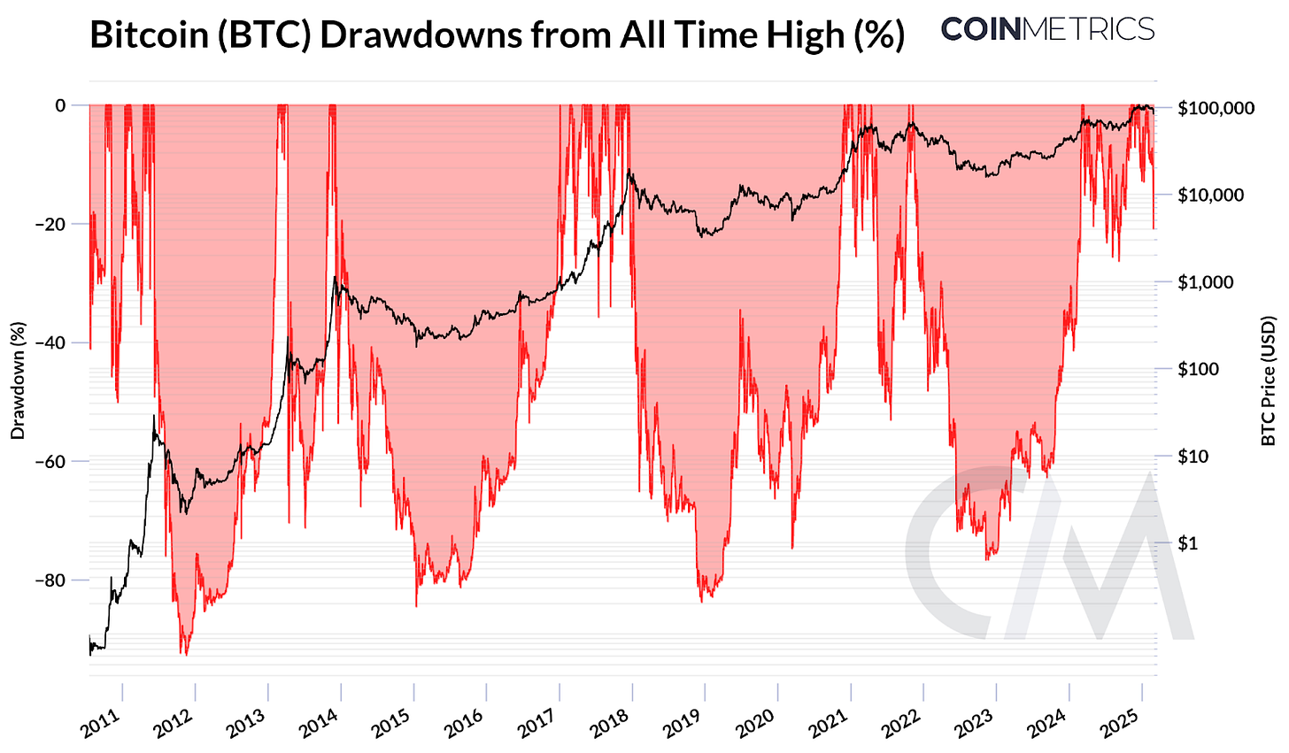 Crypto markets face renewed volatility, characteristic of patterns seen in previous market cycles. While markets were relatively resilient after Bybit’s hack, Bitcoin (BTC) experienced a >20% drawdown, falling to ~$78K on February 28th. While this correction may have unsettled some investors, it's not uncommon to see pullbacks of this magnitude during bull markets. In 2017, when BTC ran up from ~$9000 to ~$19,000, it faced several drawdowns greater than 25%, which also occurred in 2021, during its rise to $60,000.