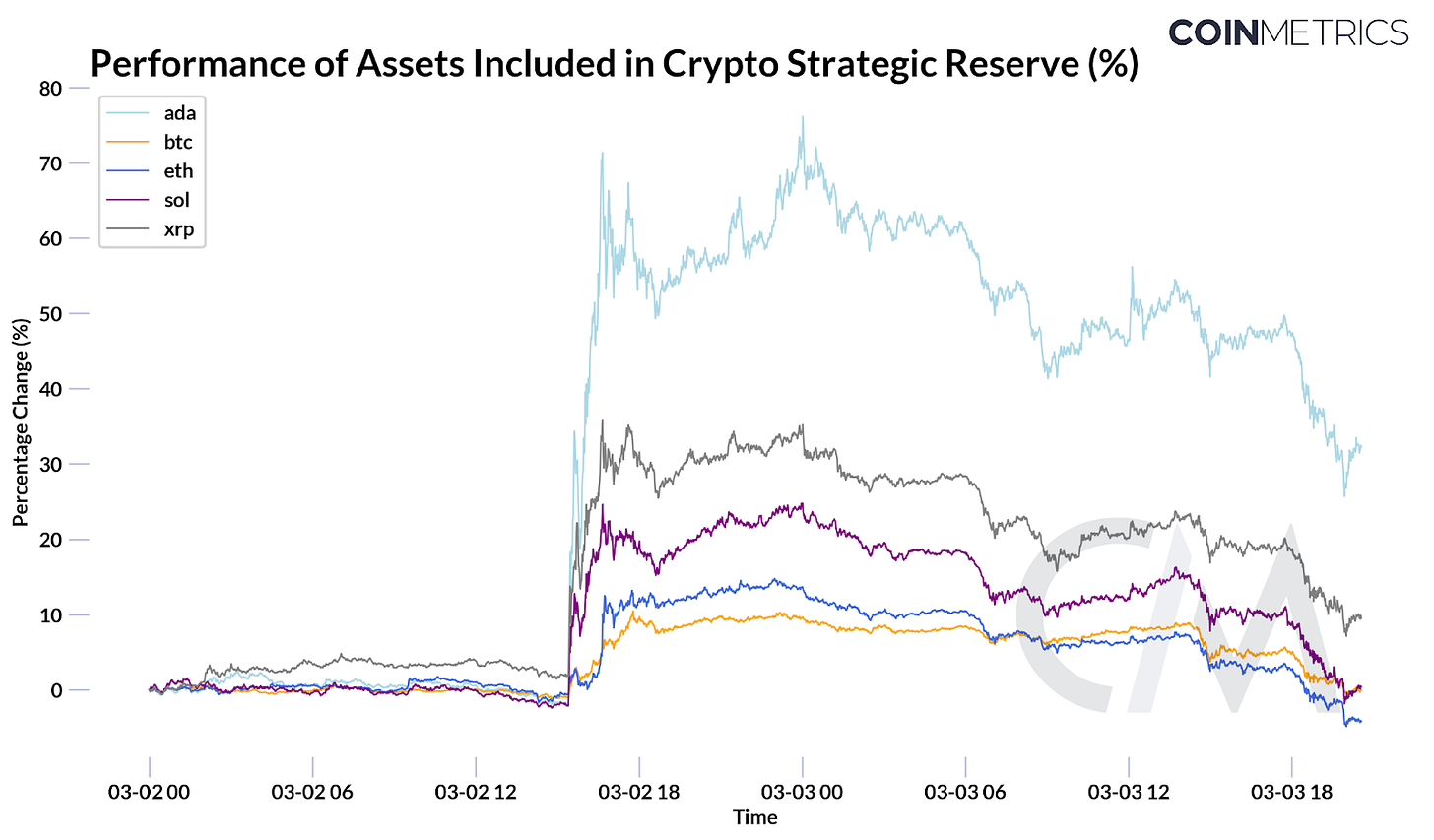 The drop was short-lived, as Trump announced his intent to “move forward” with establishing a “Crypto Strategic Reserve” including Bitcoin (BTC), Ethereum (ETH), Solana (SOL), Ripple (XRP) and Cardano (ADA). While the unexpected weekend announcement fueled a brief rally, prices have since retraced, with BTC, ETH & SOL returning to pre-announcement levels.
