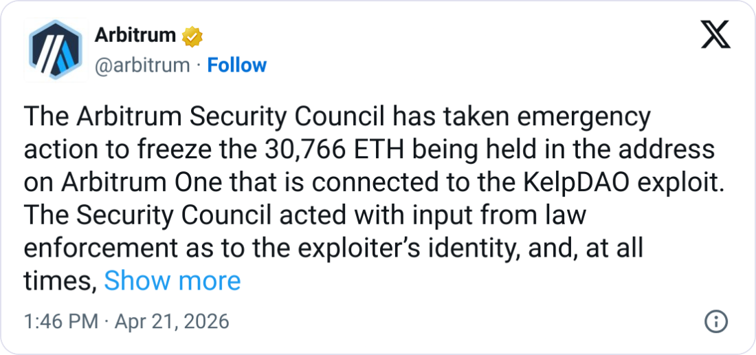 Arbitrum said on Monday that its security council, a 12-member body elected by the Arbitrum community, took “emergency action” to freeze 30,766 Ether that was held in a wallet connected to the Kelp exploit.