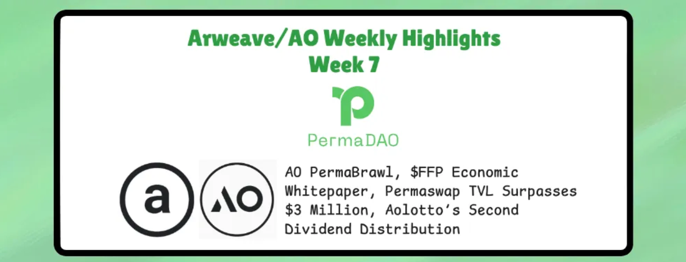 Original link: https://permadao.notion.site/Arweave-AO-Weekly-Highlights-Week-7-AO-PermaBrawl-FFP-Economic-Whitepaper-Permaswap-TVL-Surpass-19d27607c439805bacf8f81a508bfc52?pvs=4