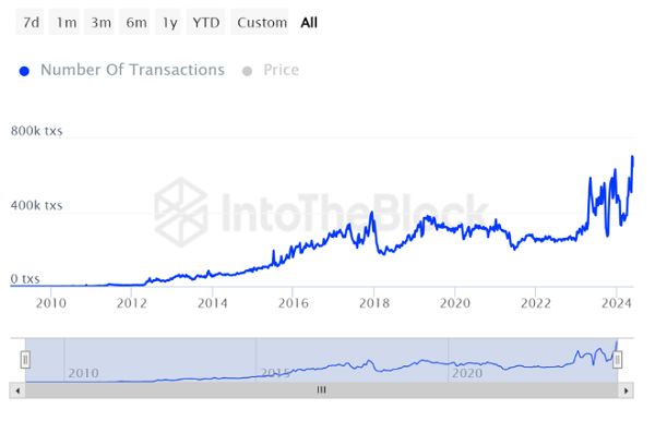 The seven-day average for Bitcoin transactions soared to an all-time peak on May 20, according to IntoTheBlock data.