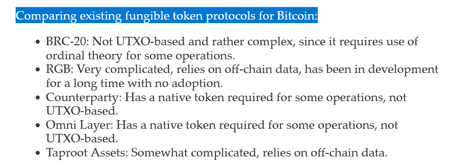 “Creating a good fungible token protocol for Bitcoin might bring significant transaction fee revenue, developer mindshare, and users to Bitcoin.”