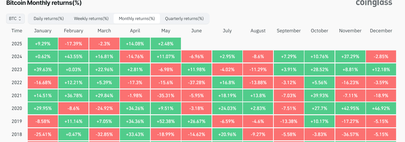 Bitcoin also shows recurring seasonal patterns, often influenced by macro cycles, institutional flows, and retail sentiment. CoinGlass data show the asset’s May performance has been negative or muted recently.