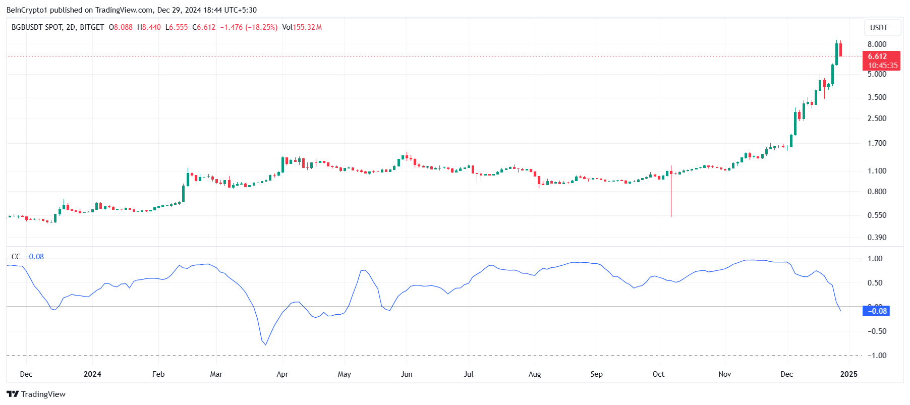 BGB’s macro momentum is being influenced by its negative correlation with Bitcoin, currently standing at -0.16. This inverse relationship means BGB’s price trajectory is moving opposite to Bitcoin’s, a trend that could be concerning if BTC’s price rises further.
