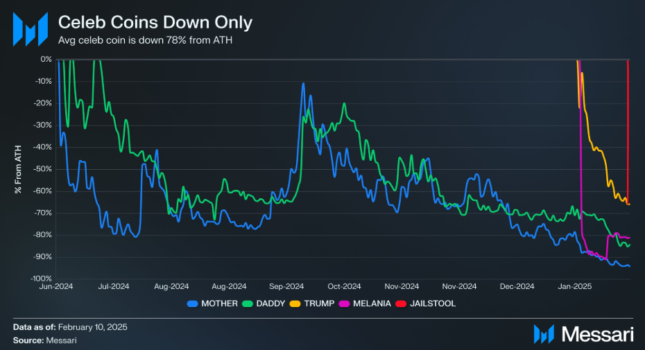 According to data from Messari, prominent tokens such as MOTHER, DADDY, TRUMP, MELANIA, and JAILSTOOL have seen an average decline of 78% since their peak valuations.