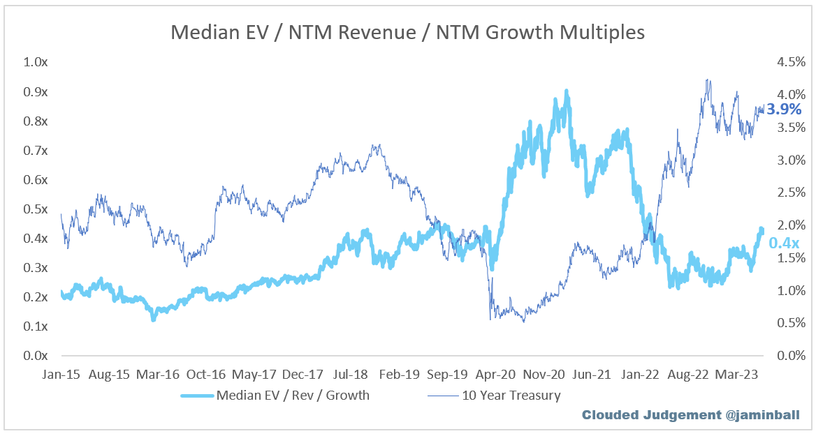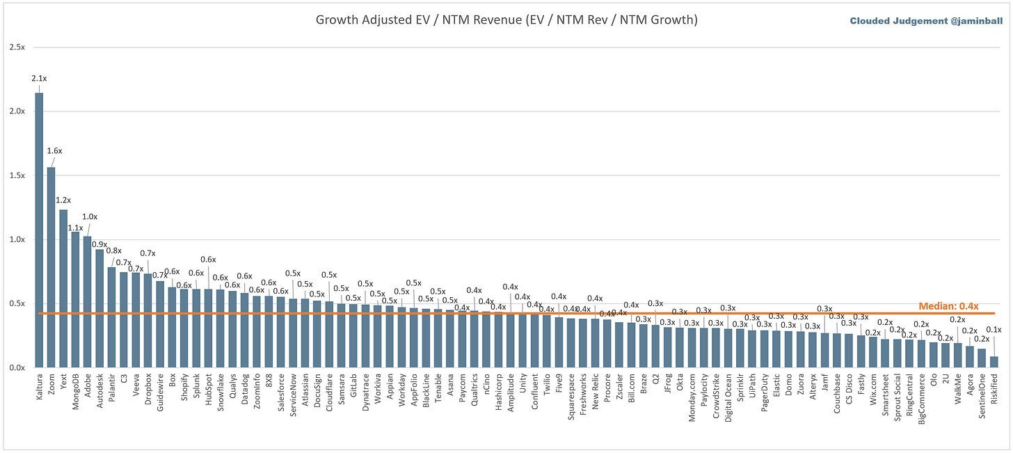 The below chart shows the EV / NTM revenue multiple divided by NTM consensus growth expectations. The goal of this graph is to show how relatively cheap / expensive each stock is relative to their growth expectations