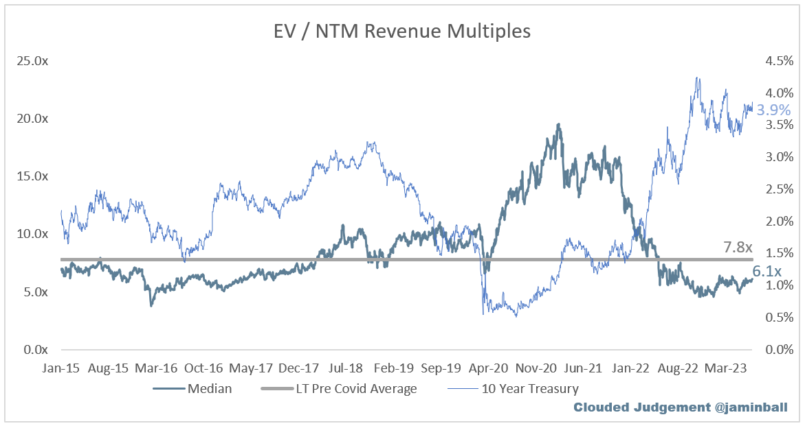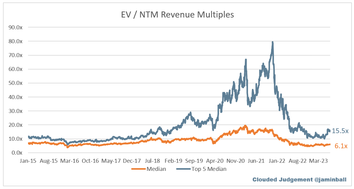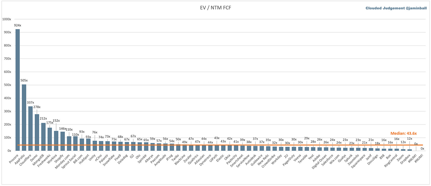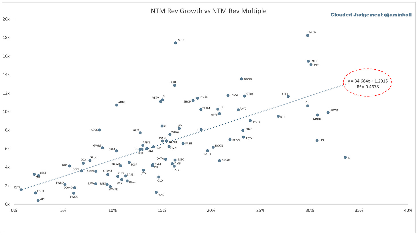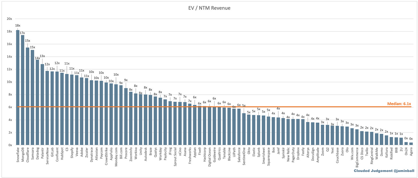 SaaS businesses are generally valued on a multiple of their revenue - in most cases the projected revenue for the next 12 months. Revenue multiples are a shorthand valuation framework. Given most software companies are not profitable, or not generating meaningful FCF, it’s the only metric to compare the entire industry against. Even a DCF is riddled with long term assumptions. The promise of SaaS is that growth in the early years leads to profits in the mature years. Multiples shown below are calculated by taking the Enterprise Value (market cap + debt - cash) / NTM revenue.