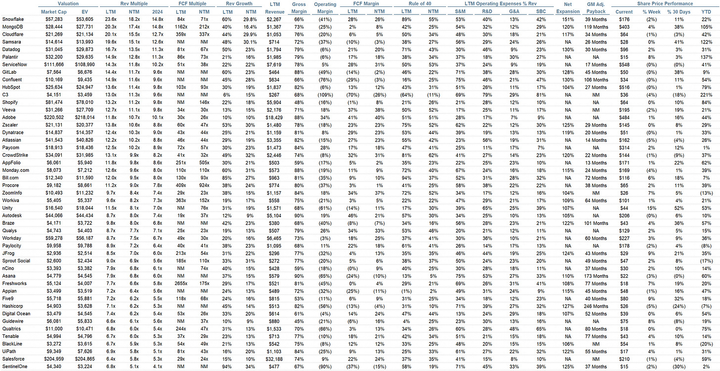 Rule of 40 shows rev growth + FCF margin (both LTM and NTM for growth + margins). FCF calculated as Cash Flow from Operations - Capital Expenditures