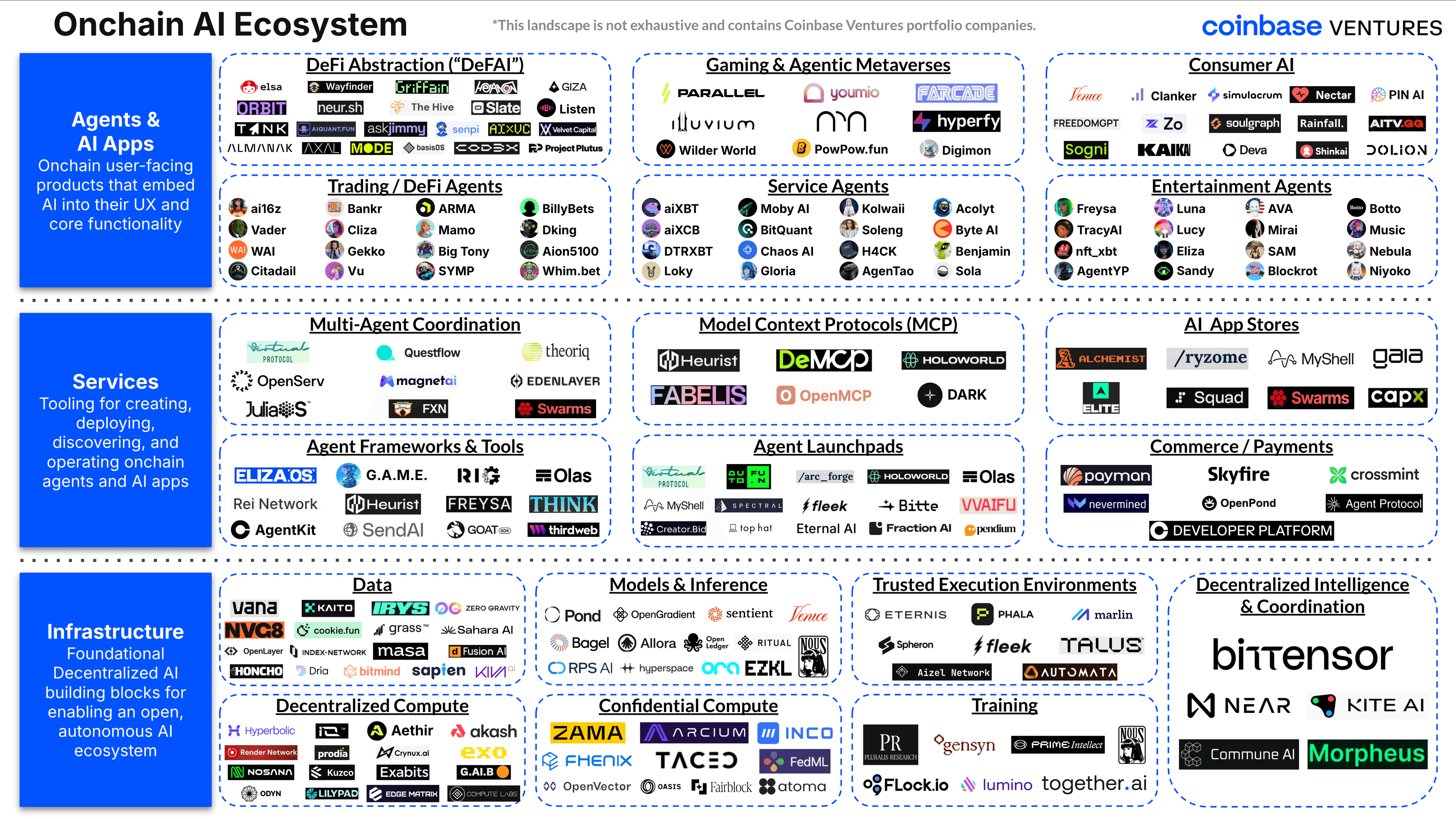 TL;DR: The convergence of Crypto and AI is giving rise to a burgeoning Onchain AI economy, an ecosystem of blockchain apps and services run by autonomous AI agents. And while Decentralized AI projects have seen the lionshare of funding and growth over the last 18 months, we believe Onchain AI is gaining momentum and signaling the next phase of rapid innovation at this intersection. The importance of Onchain AI lies in expanding crypto to potentially billions of AI-powered participants. Every autonomous AI agent is like a new “user” of blockchains that can operate 24/7 and make sophisticated decisions, driving a significant increase in onchain activity and growth. Through investing in Onchain AI, Coinbase Ventures is supporting the builders of this future agent-based economy, ultimately paving the way to a new “Agentic Web”.