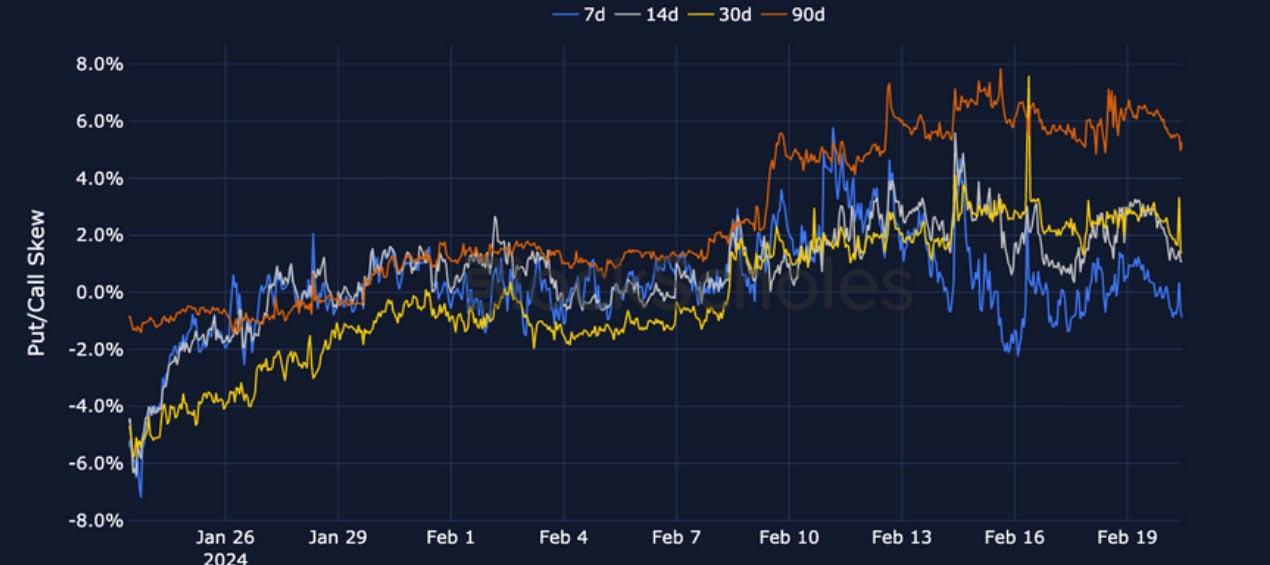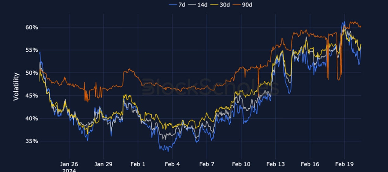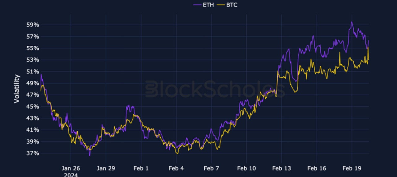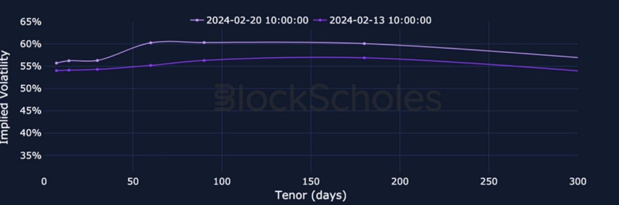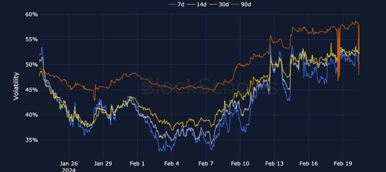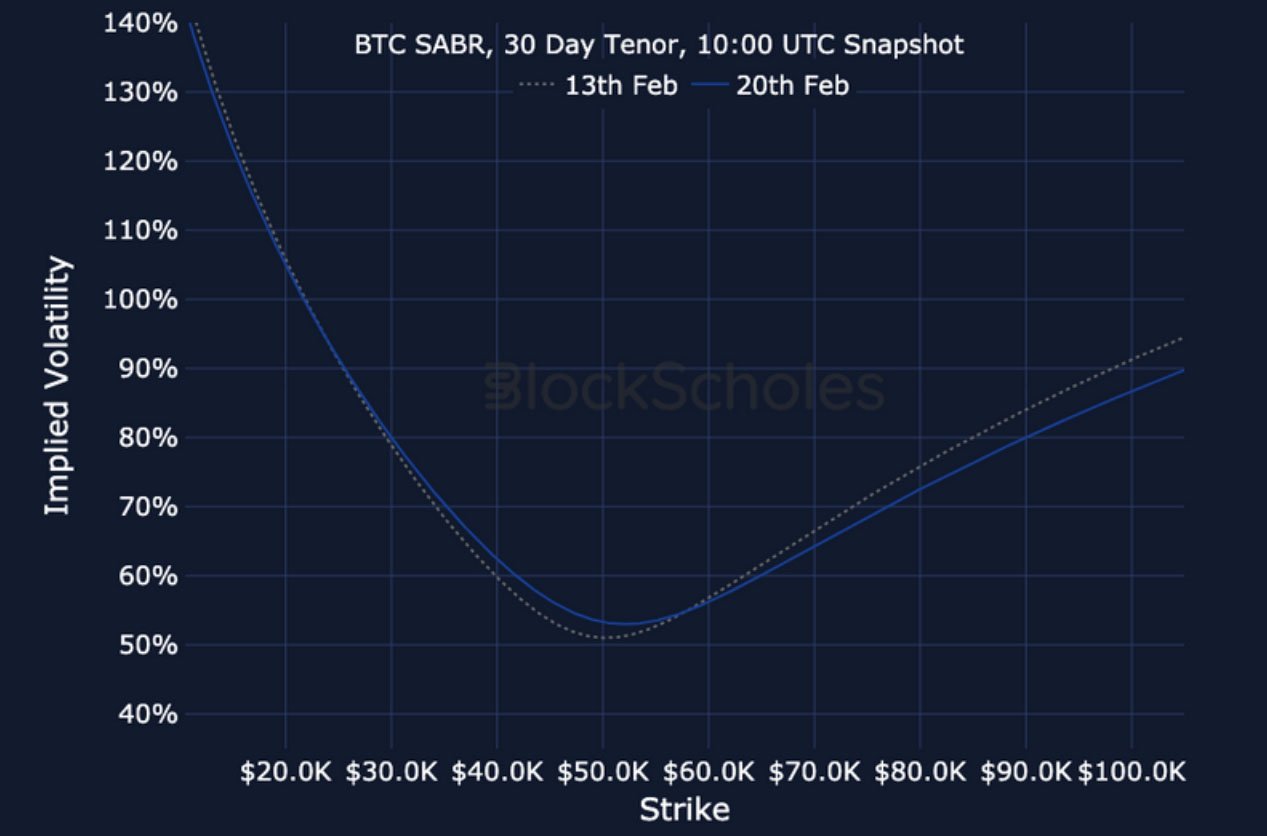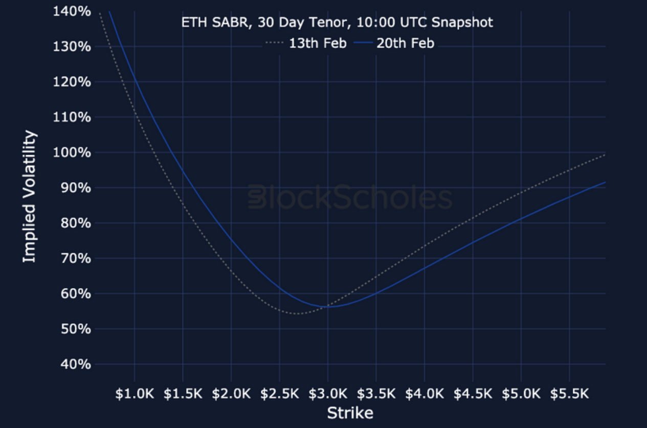 ETH SABR ATM IMPLIED VOLATILITY – ETH’s volatility reports a similarly high and consistent rise in February, rising slightly higher at a 3M tenor.