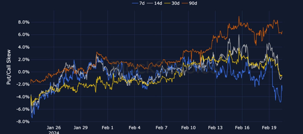 BTC 25-Delta Risk Reversal – the skew towards OTM calls has shown no signs of reversing yet, reporting a strong tilt at longer-dated tenors.