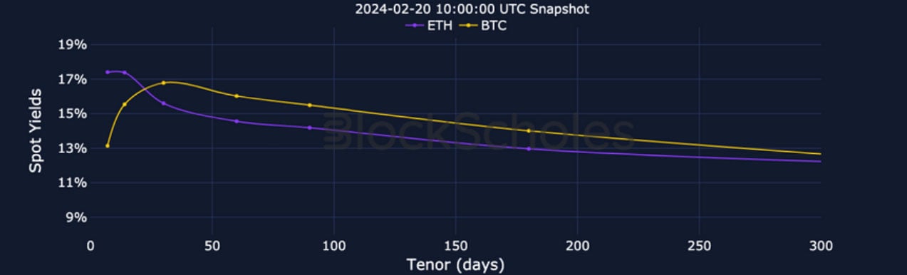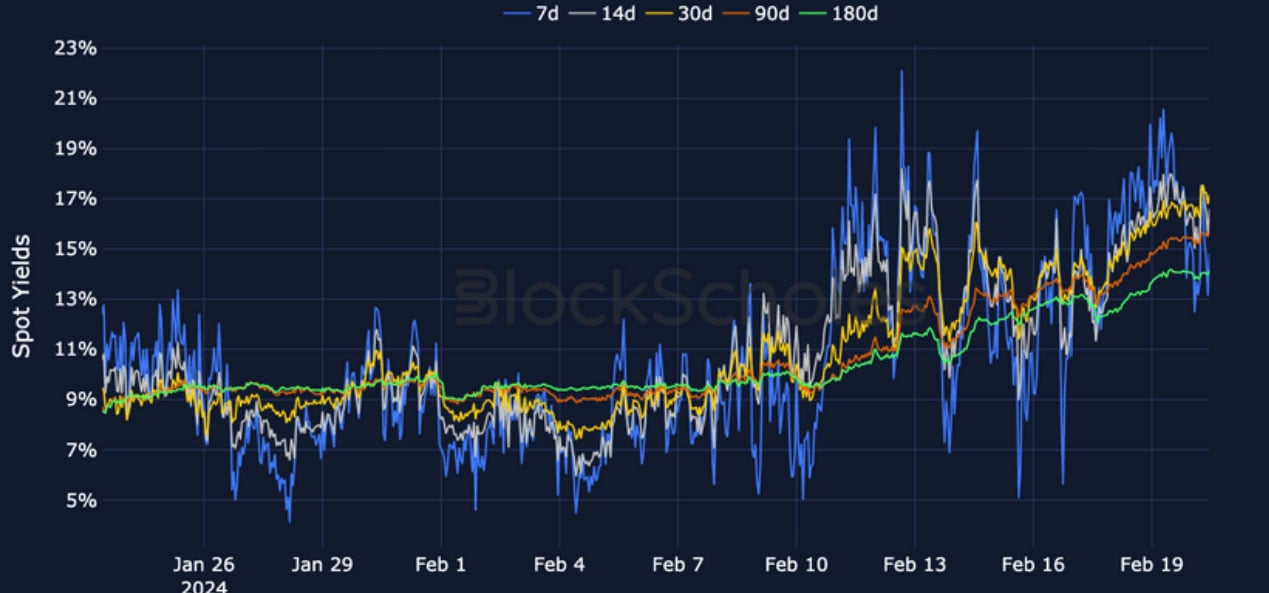BTC ANNUALISED YIELDS – have consistently risen over the past 10 days to their highest levels since the buildup of leverage ahead of BTC’s ETF.