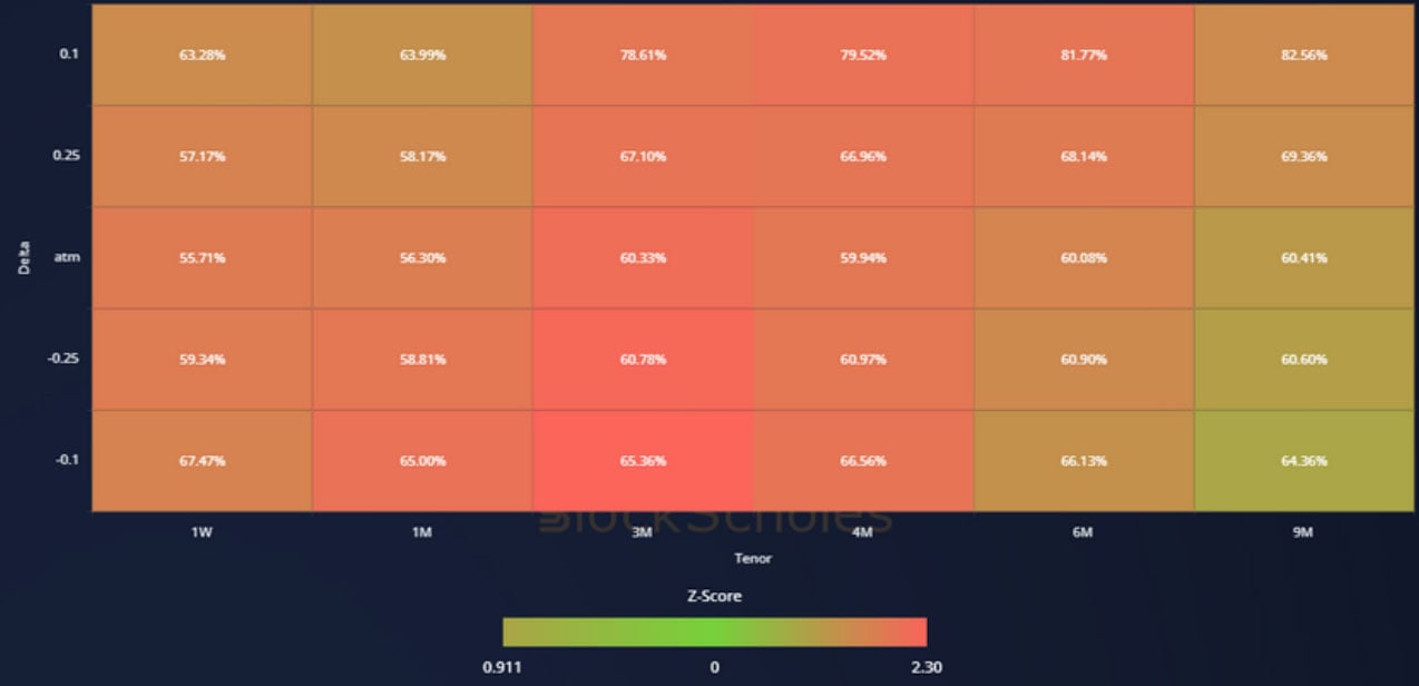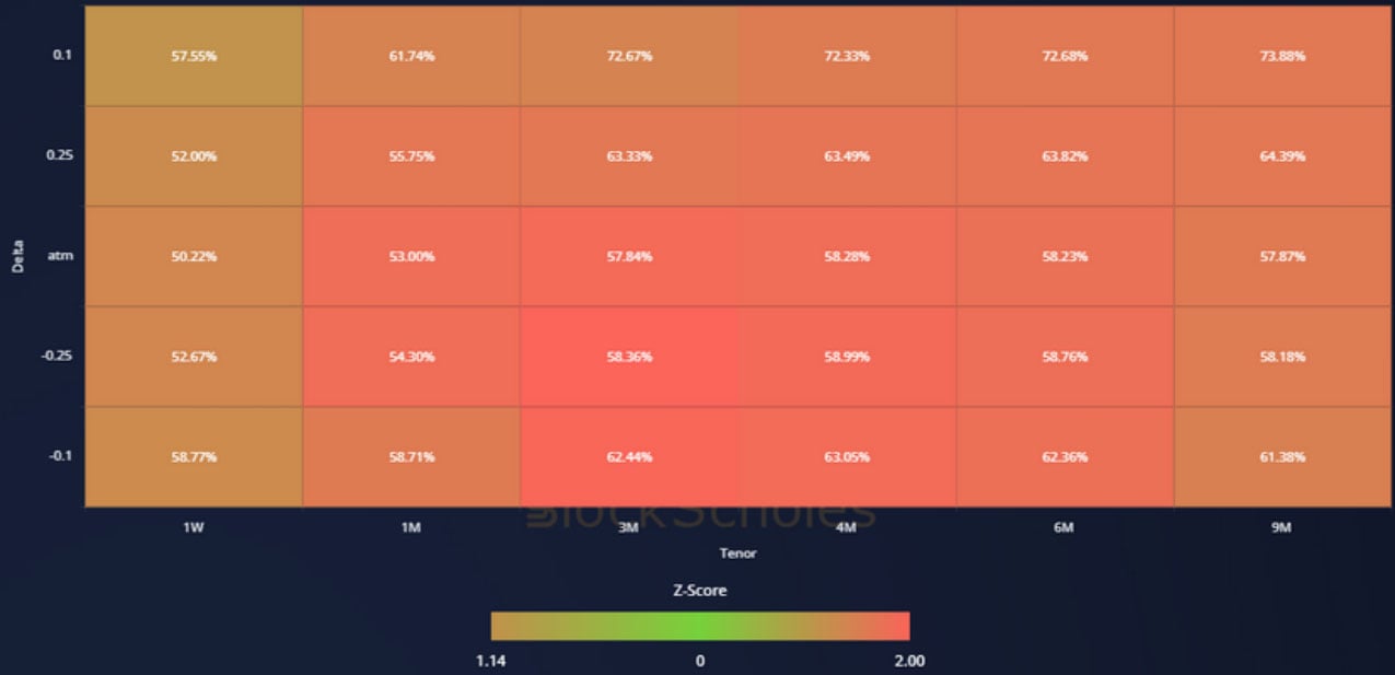 ETH IMPLIED VOL SURFACE – like BTC reports a consistent and strong trend upward over the past 30 days, focused slightly on 3M and 6M tenors.