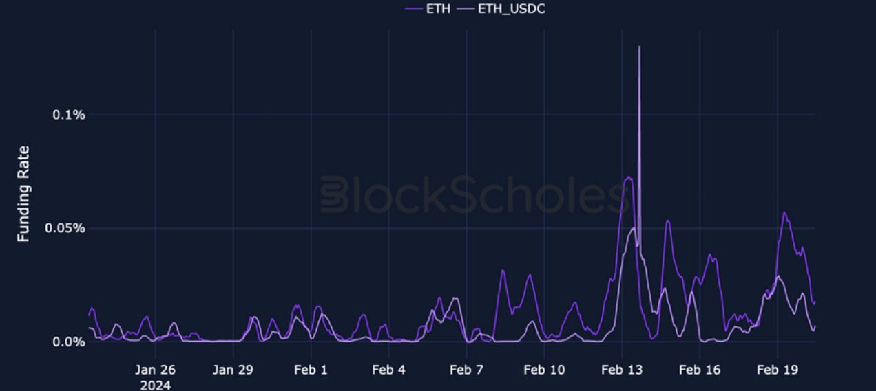 ETH FUNDING RATE – perpetual swaps continue to trade at slight premiums to spot prices, as reflected in the consistently high funding rate.
