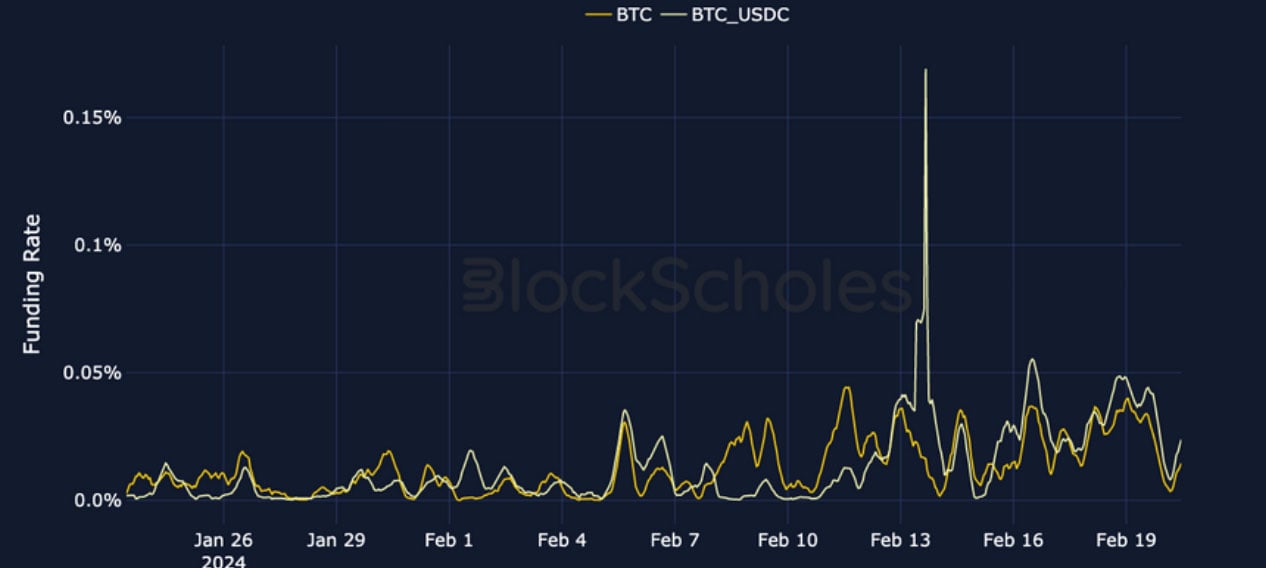 BTC FUNDING RATE – funding rates have remained consistently positive over the past month, indicating demand for leveraged long exposure.