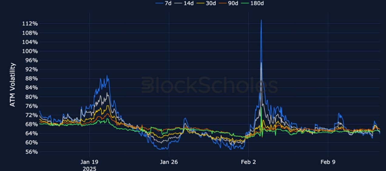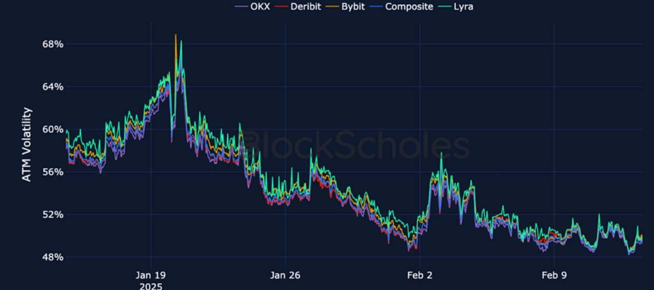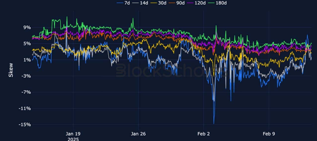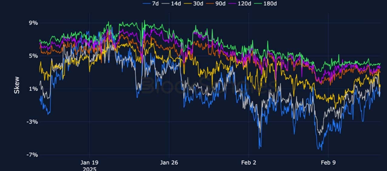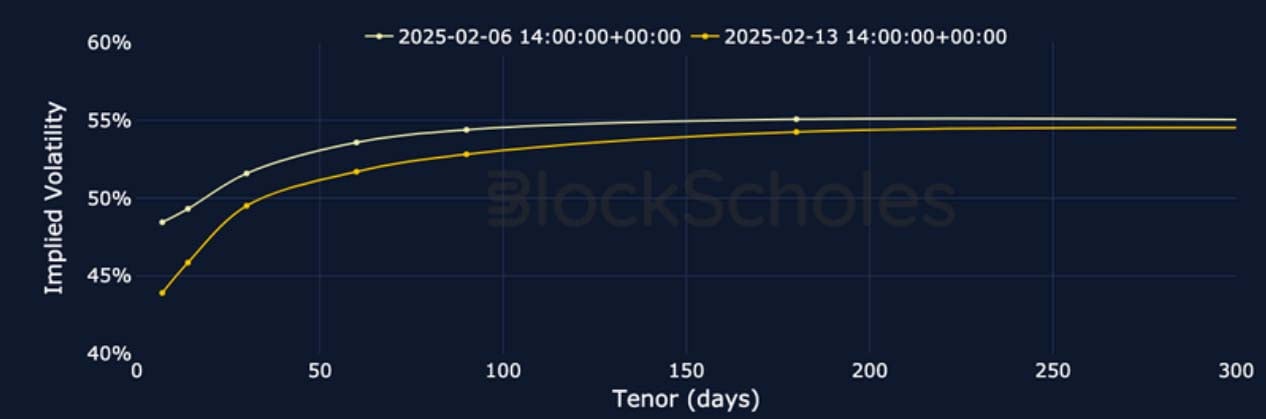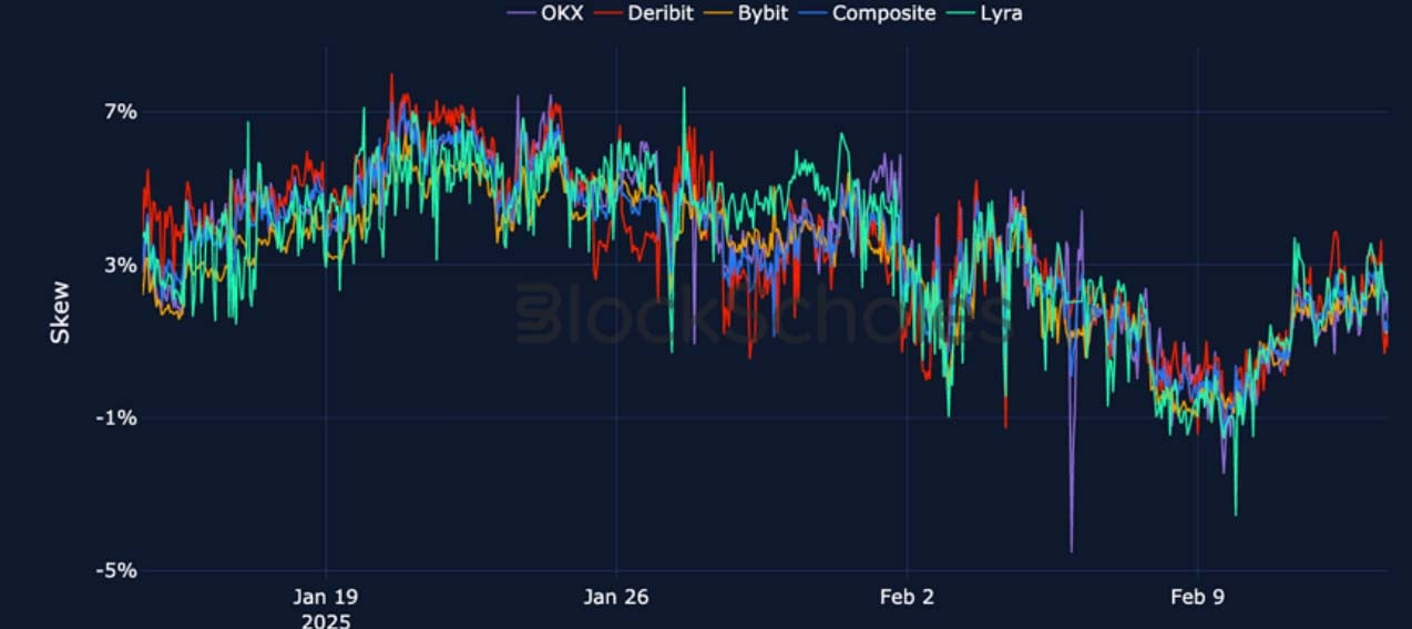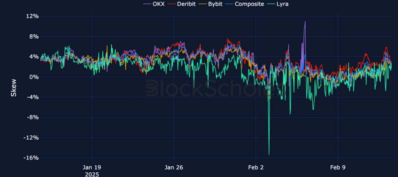 A near-two week long period of choppy, sideways spot price action has taken its toll on derivatives markets. Futures yields have trended down to their lowest levels of 2025, while BTC’s funding rate remains far below the highs of mid-January. ETH’s funding rate shot sharply negative during the Feb 3 selloff, and has since traded at a neutral level. Short tenor volatility smiles, having remained skewed firmly towards OTM puts since that same selloff, have recently changed course and now price OTM calls at a volatility premium.