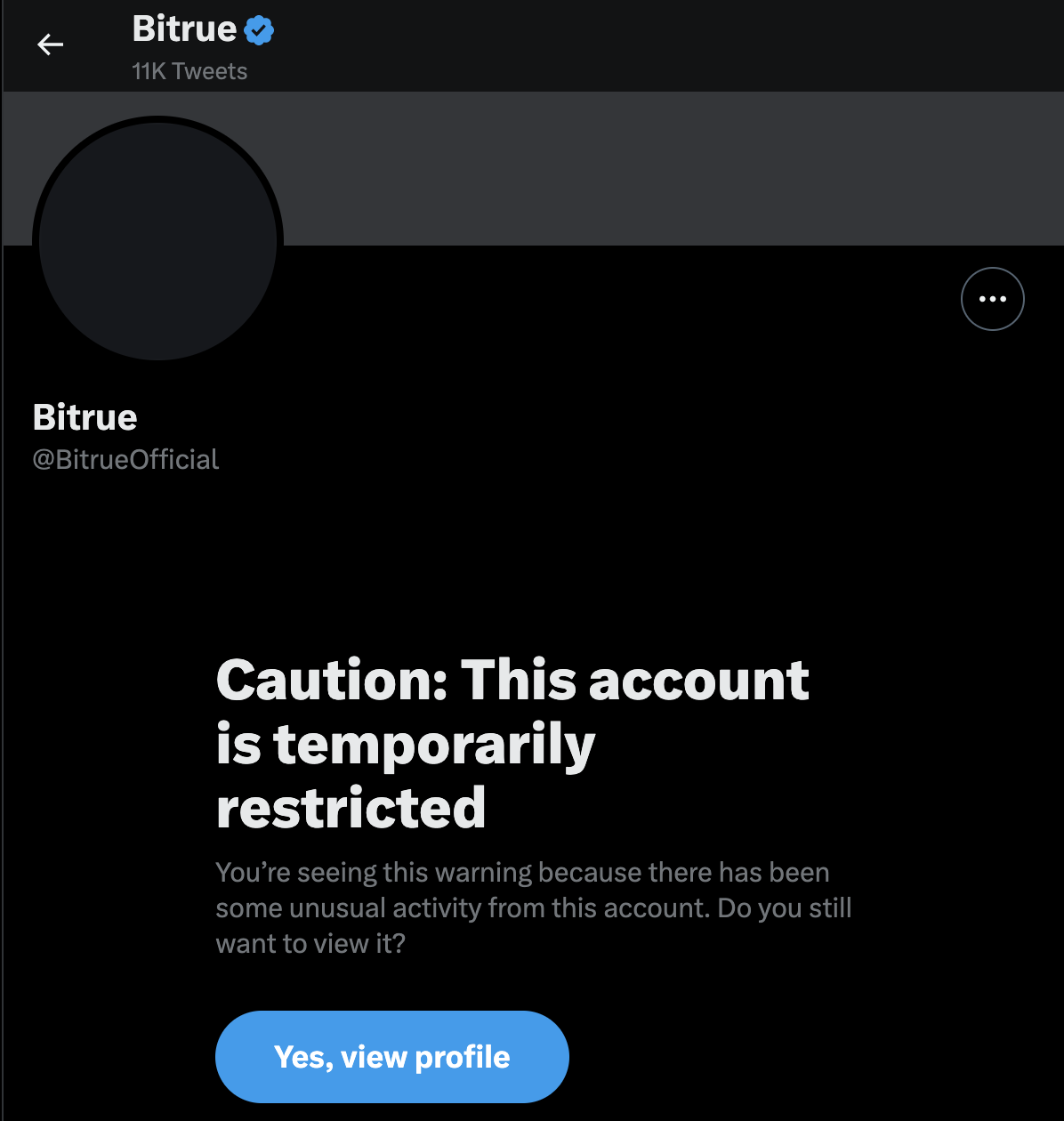 Furthermore, Bitrue's Twitter account has been restricted for reasons that remain unclear. As of the time of reporting, the account has not yet been restored.