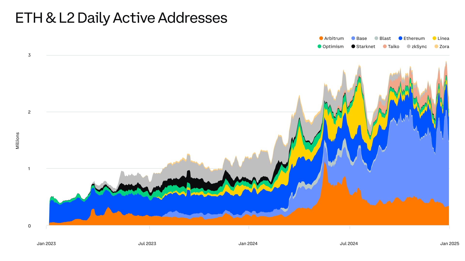Daily active addresses in the Ethereum ecosystem increased nearly 150% in 2024, led by a pickup in L2s, with Base leading the way.