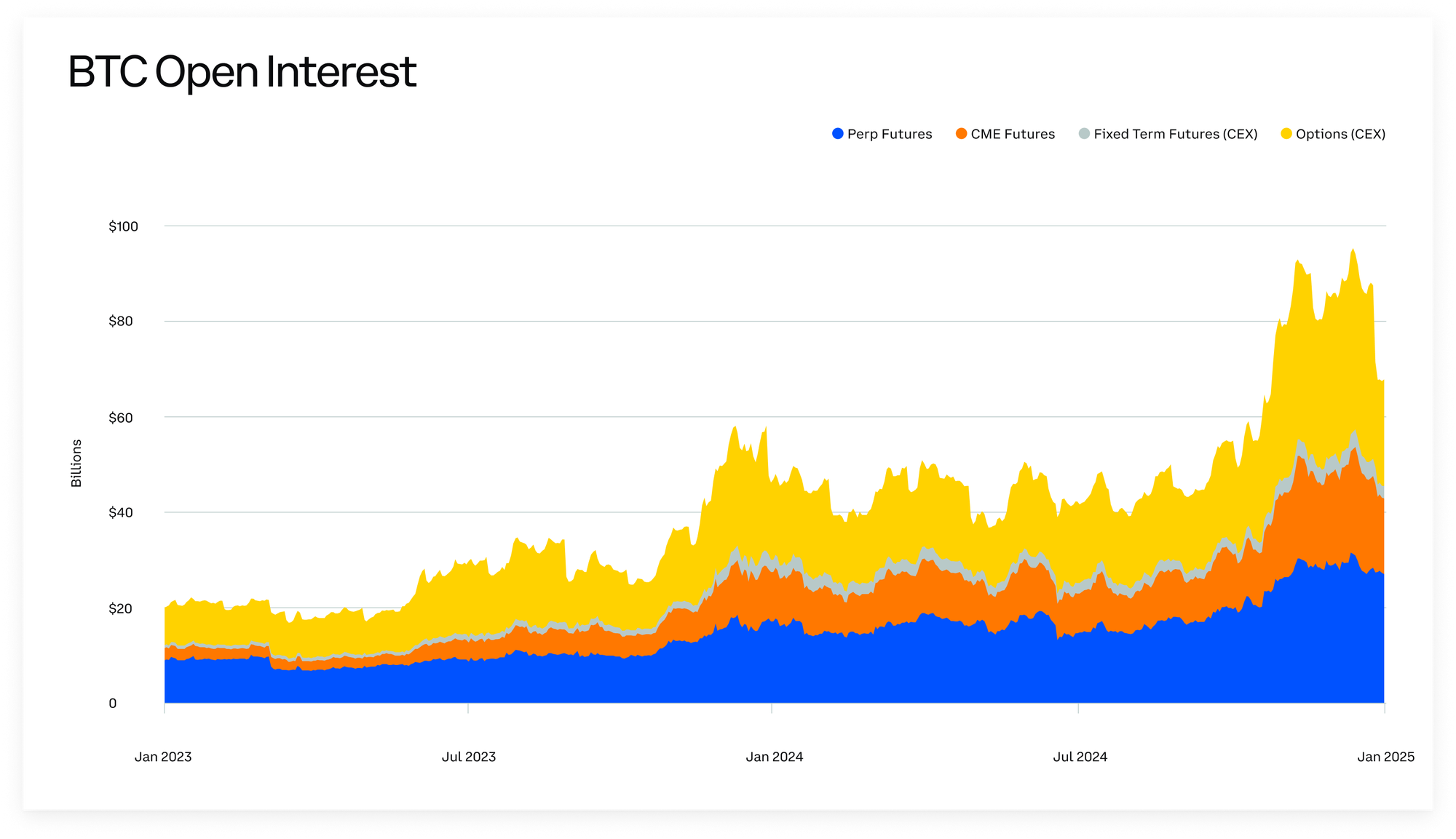 Open interest in BTC derivatives increased by 60% in Q4 to nearly $100B.