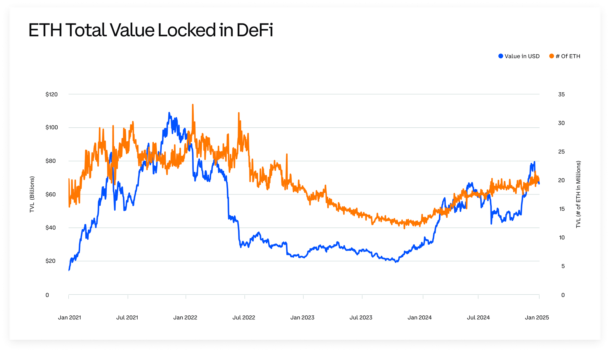 The number of ETH locked in DeFi rose 6% in Q4 and 58% for the year.
