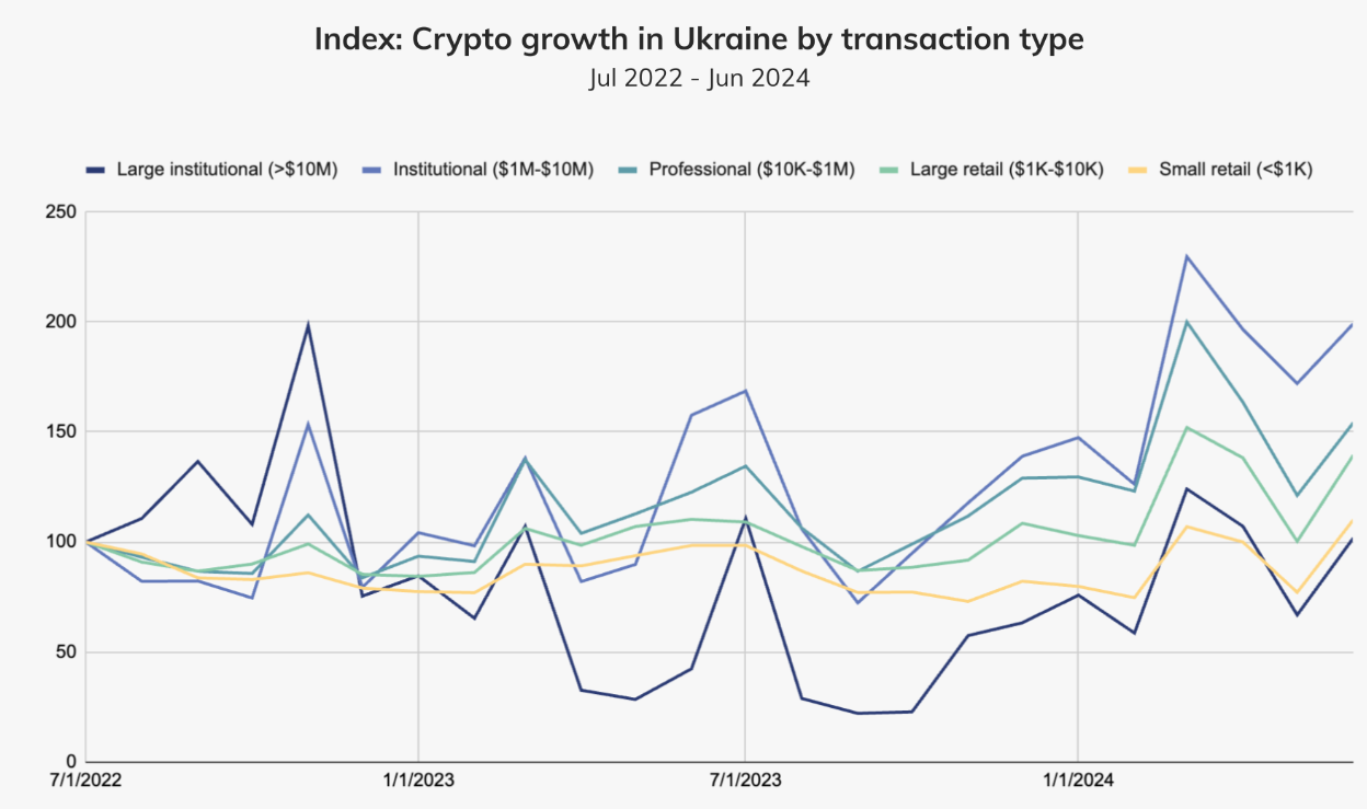 In Ukraine, institutional and professional transfers have driven much of the market’s growth. According to Chainalysis, large institutional transfers of over $10 million and mid-sized institutional transfers from $1 million to $10 million accounted for most of the transactions in 2024.
