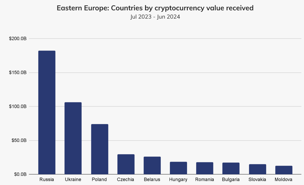 Russia received over $182 billion worth of crypto flows, while Ukraine recorded over $106 billion, second in the region.