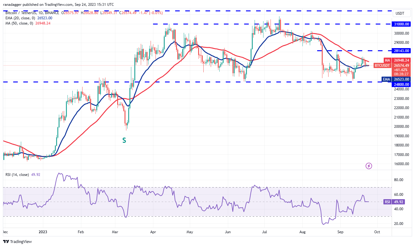 The bulls have managed to sustain Bitcoin’s price above the 20-day exponential moving average (EMA) of $26,523, but they have failed to start a strong rebound. This indicates a lack of demand at higher levels.
