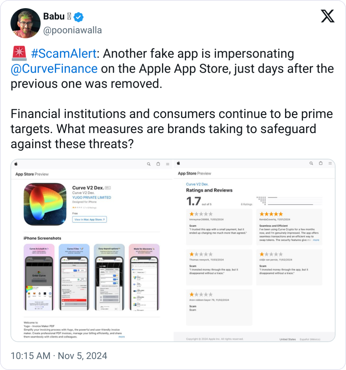 The persistence of fake Curve Finance apps and other scam apps appearing on the Apple App Store and Google Play reveals a growing need for user security and a vulnerability that still needs addressing.
