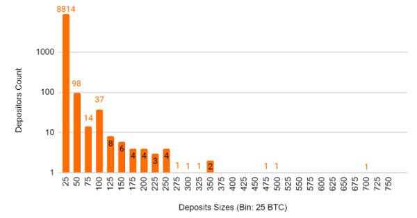 Of those inflows, smaller purchases of 25 or fewer Bitcoin dominated the presale with 8,814 transactions. The second most frequent volume range was 26 to 50 Bitcoin in 98 transactions. The highest single purchase was recorded for 699 Bitcoin and the second-highest for 499, which can be traced back to BTC-e.