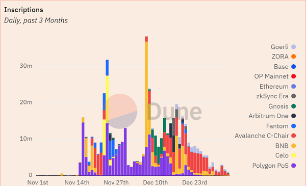 An analysis of EVM inscriptions on Dune Analytics over the past three months revealed a notable rise in volume in December. The data showed that at least three networks experienced daily inscription counts of over 1 million on certain days in December.