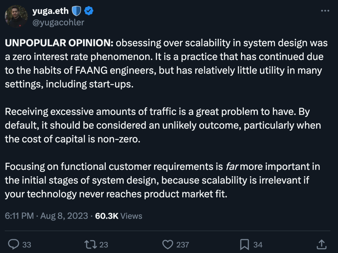 As Recmo rightly pointed out in the debate, you must solve hard tech problems when building for 1B users. But most apps and infra don't need more scalability. They need more users.