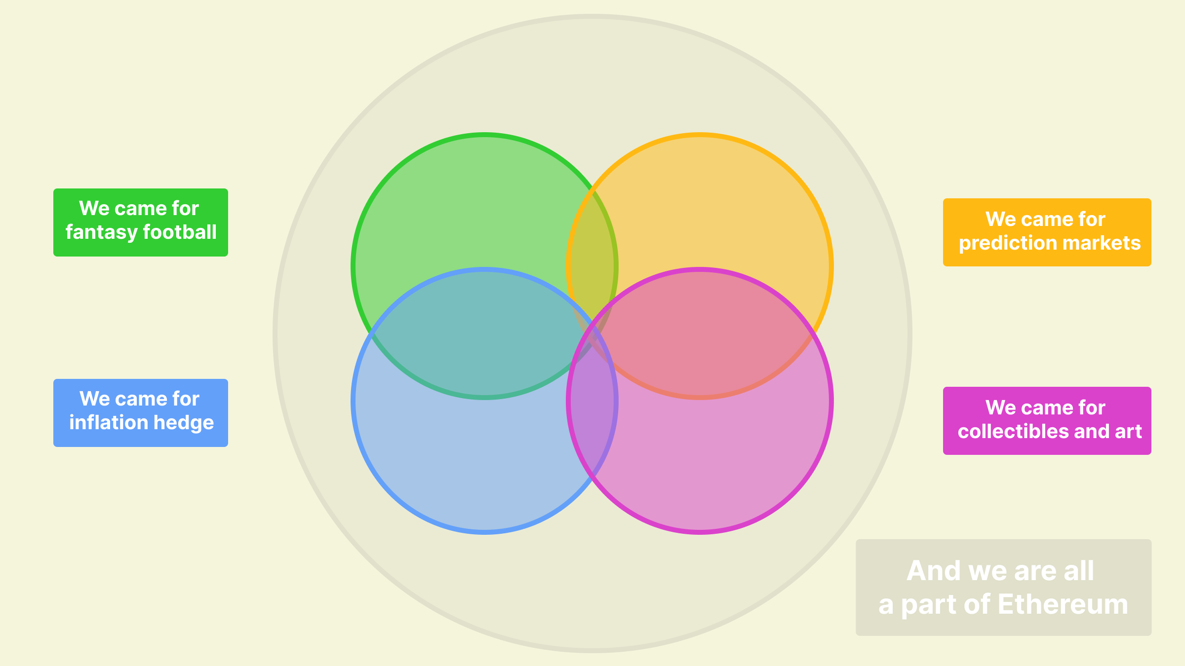 Same with people who decided to play fantasy football on Sorare, bet on Polymarket, and just hold stablecoins in high-inflation countries like Argentina. They start with a narrow use case, and afterward, some explore Ethereum, buy NFTs, trade on DEXs, and join DAOs.