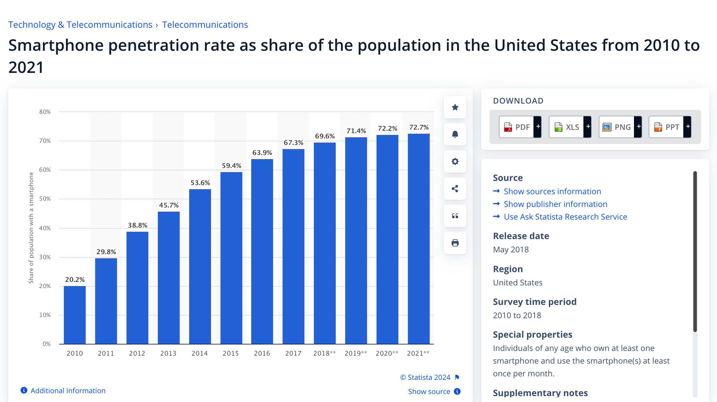 Instagram started in 2010 when over 20% of the US population had smartphones: