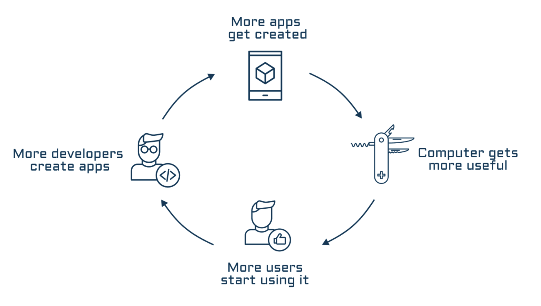 That created a virtuous circle where every new successful app made some new people want to buy Apple computers. Same with iPhones.