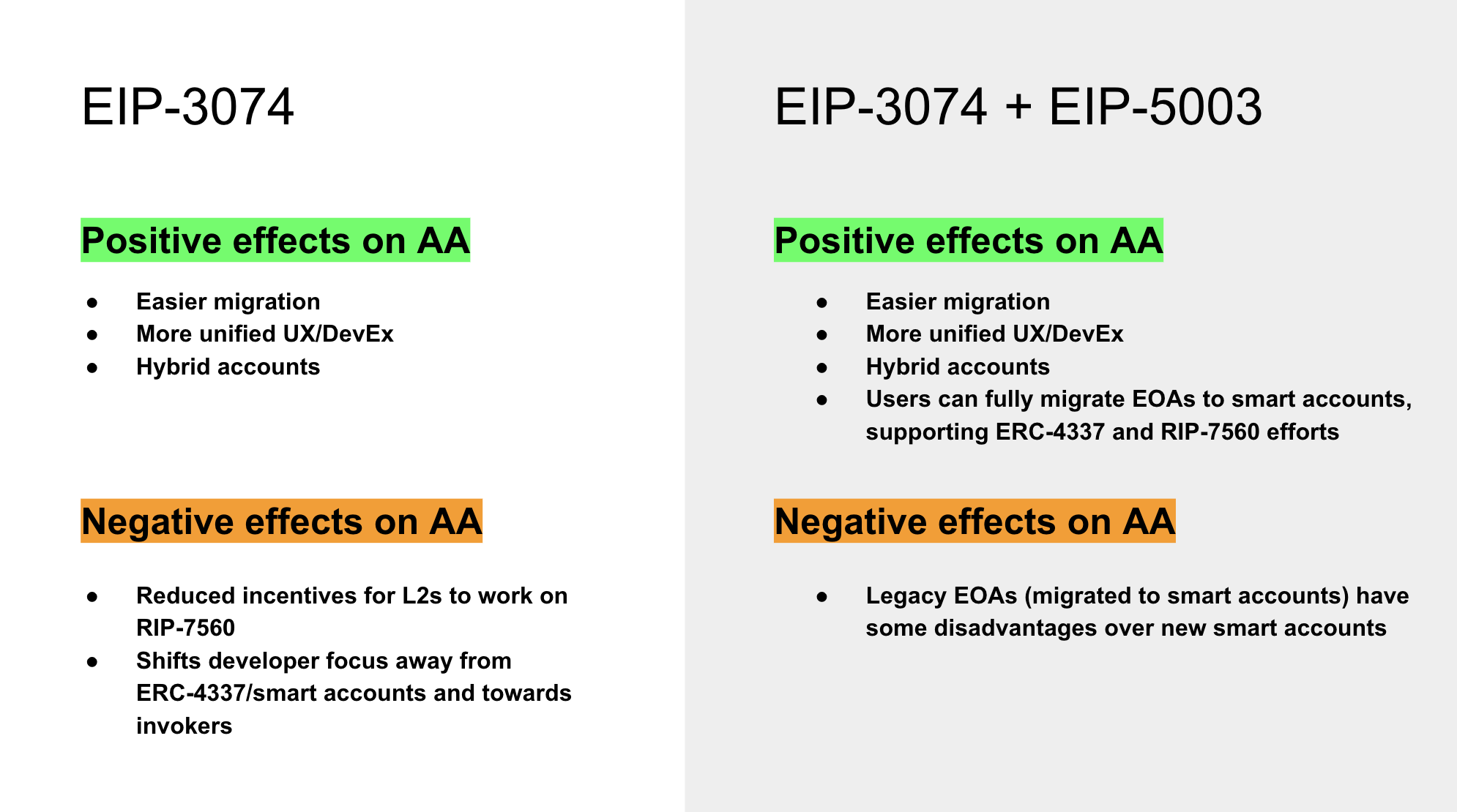 Effects of EIP-3074 on AA roadmap, with/without EIP-5003