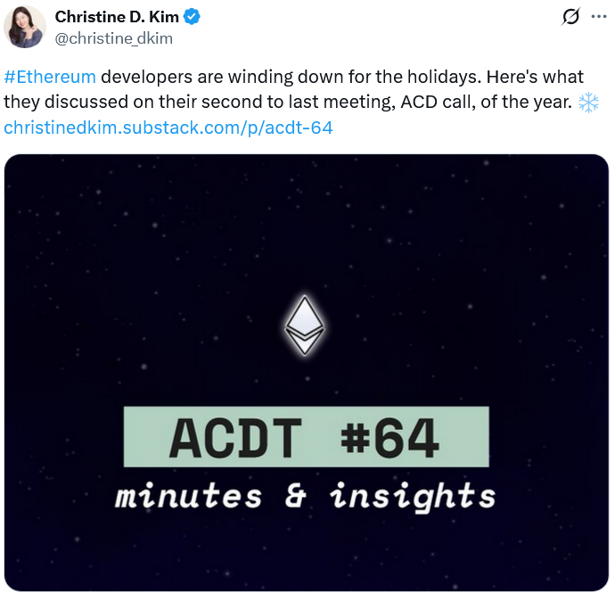 Christine Kim, vice president of the research team at Galaxy Digital, shared a summary of the All Core Developers meeting on Monday, in which Nethermind representatives said developers should be ready to move forward with a gas limit increase after the next BPO hard fork on Jan. 7.