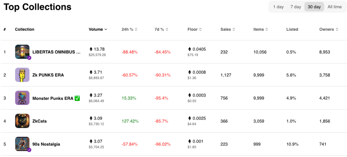 The top 5 NFT collections by volume include zkApe, zkRock and zkAnimals, collections that managed to generate +100 ETH in traded volume as well as consistent floor prices (on the 2 digit dollars)