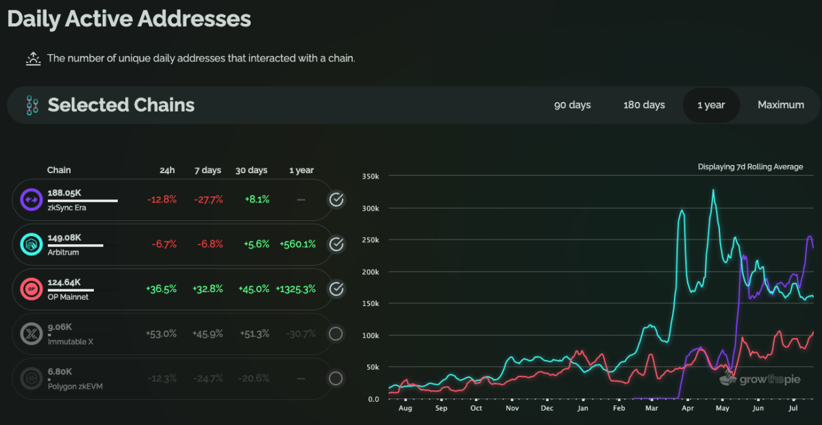 In terms of activity, the network has seen an increased number of users and activity, with wallets surpassing the 1MM users and daily active users (DAUs) exceeding 190K per day, positioning ZkSync as the L2 with highest DAUs, surpassing projects like Arbitrum or Optimism