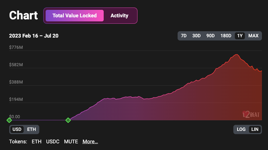 At the time of this writing, Mute is the second largest protocol by TVL, with the highest number of trading pairs.