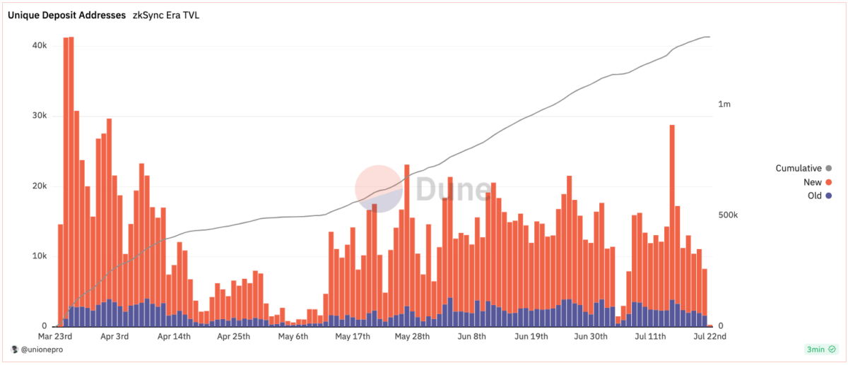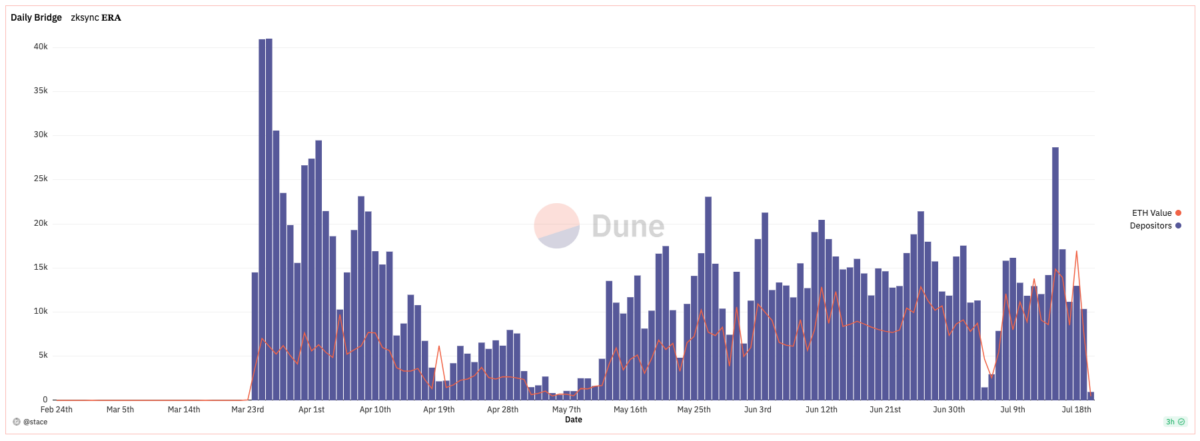 ZkSync Era was launched in March 2023. After an initial surge of activity at launch, bridging of assets have stabilized at around ~12,000 depositors per day.